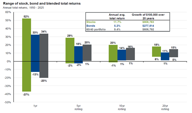 Risk management is the core of portfolio management, and proper risk management starts with the proper asset allocation. The chart below is an important depiction of the range of historical return outcomes over time.