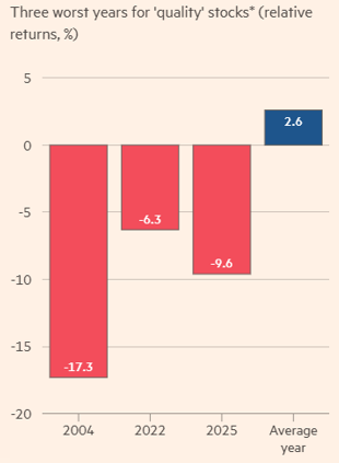 One interesting theme to watch in 2026 is the performance of quality stocks. There is no generally accepted definition of what determines a quality stock, however most would agree that low debt, high returns on equity and invested capital, high cash flow, and sustainable competitive advantages are at the top of the list of qualifications for quality. The Financial Times recently published data comparing the returns of quality stocks relative to the market over the last 30 years.